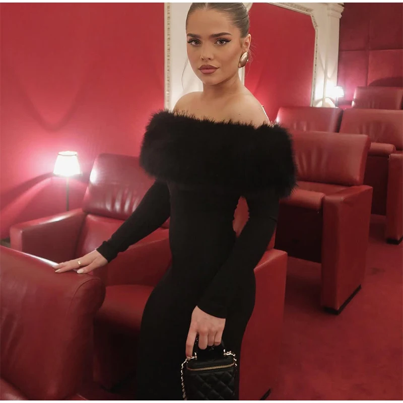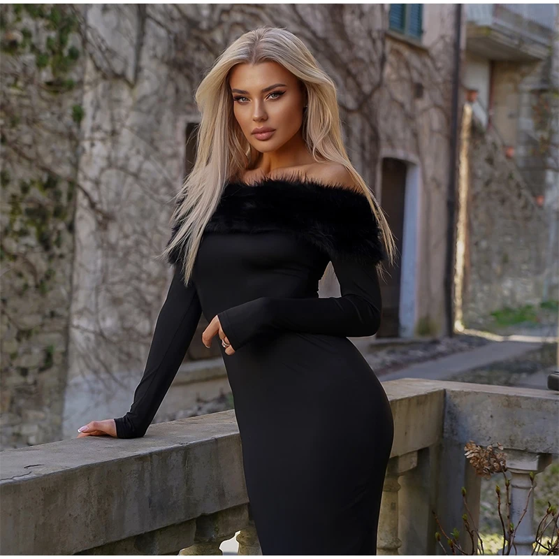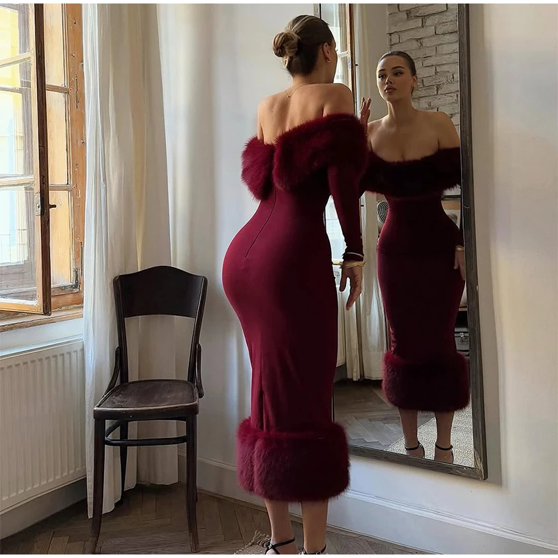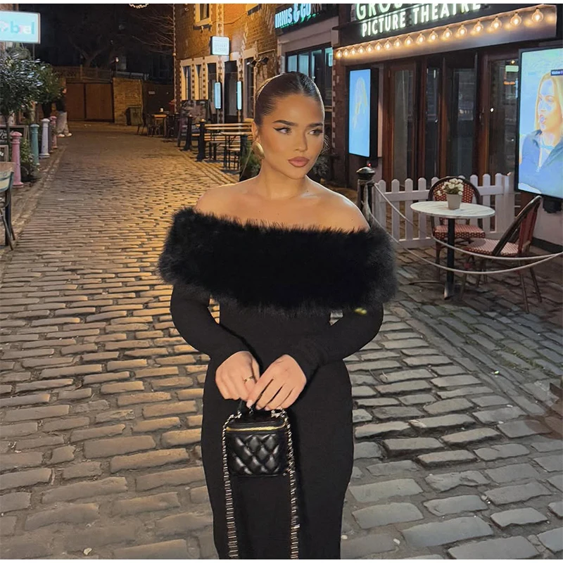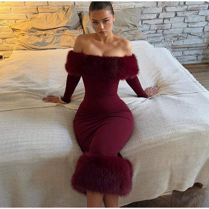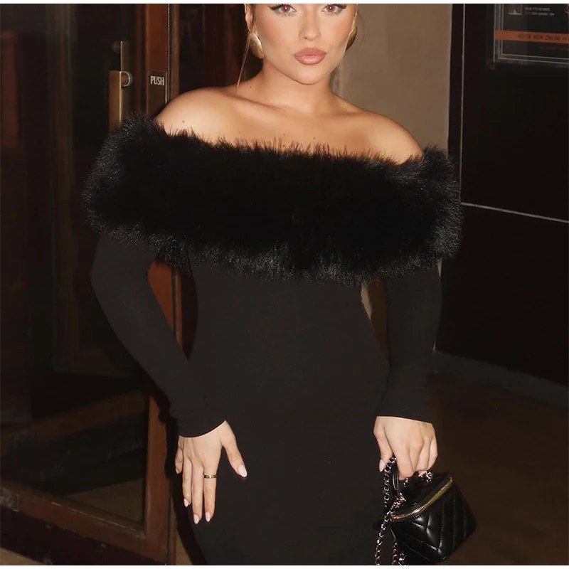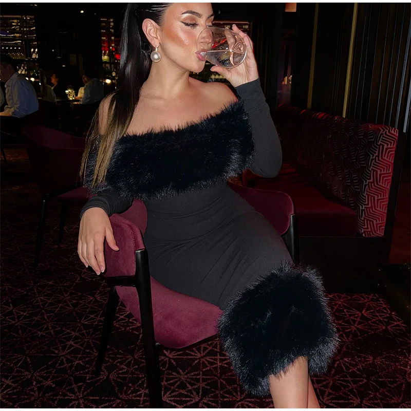 Strapless Faux Fur Patchwork Dress Women Sexy Off-shoulder Full Sleeve Cinched-waist Bodycon Dresses Lady Party Evening Gown